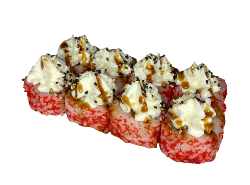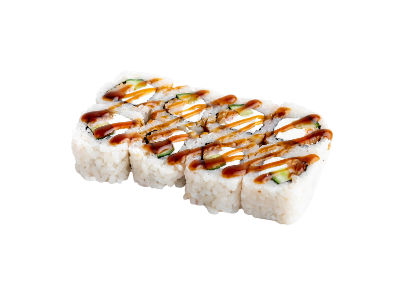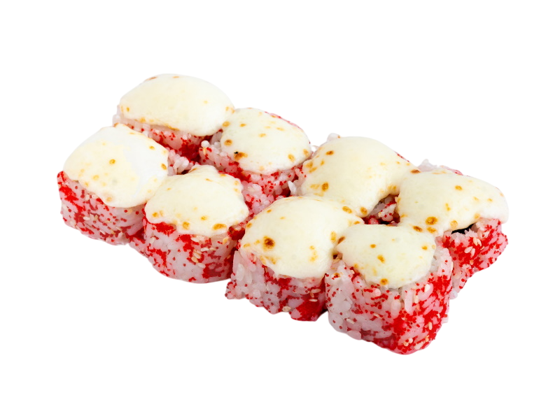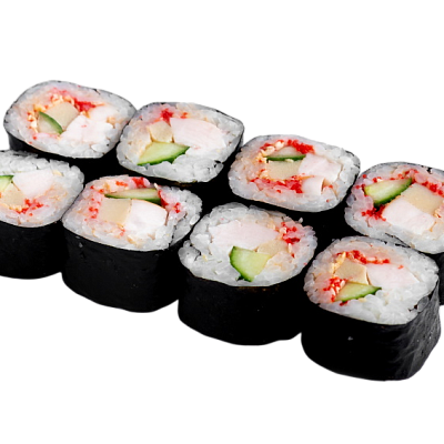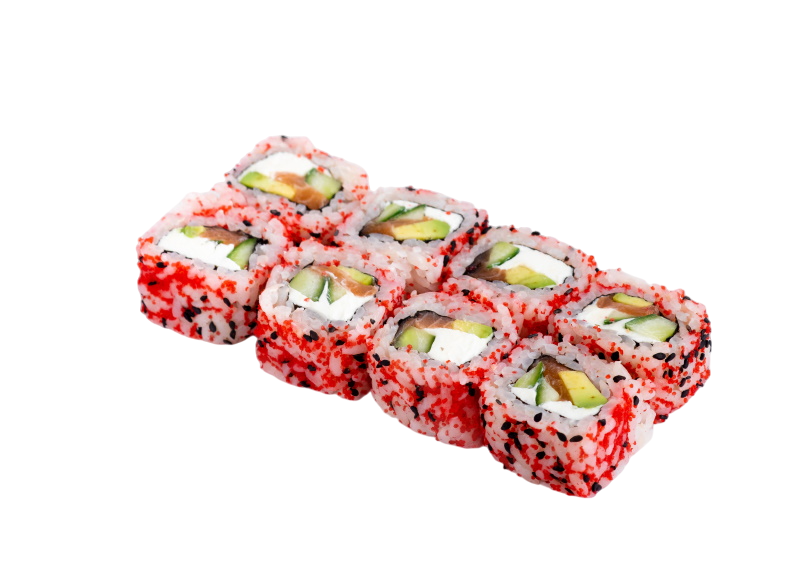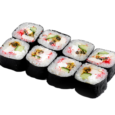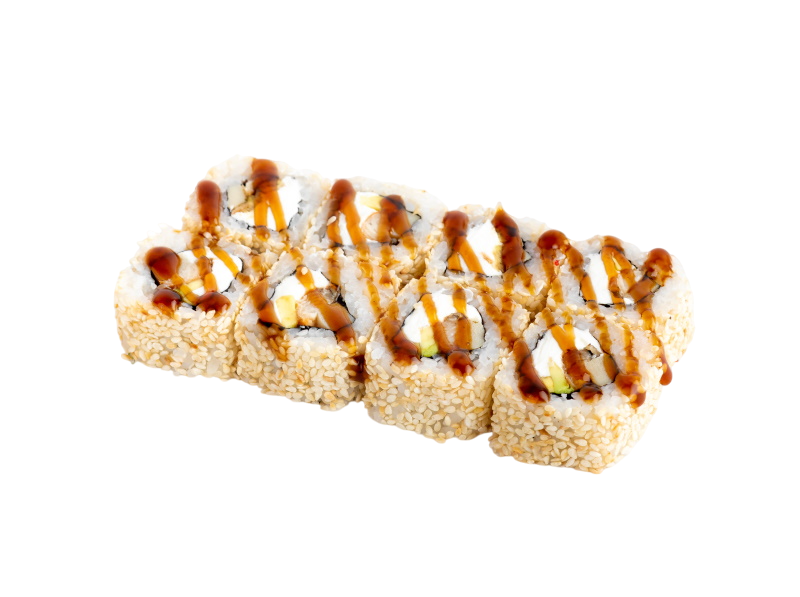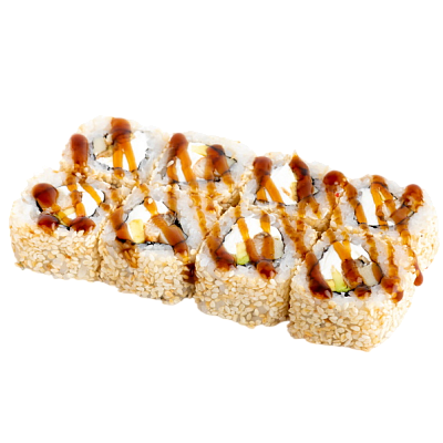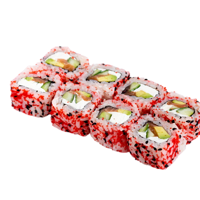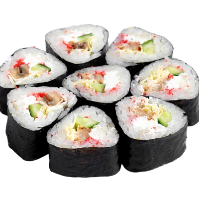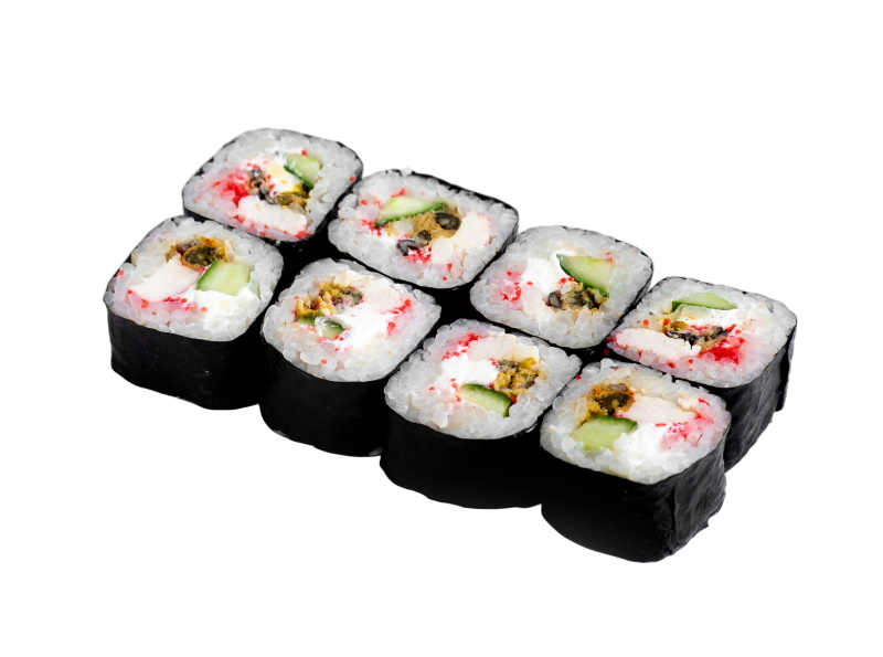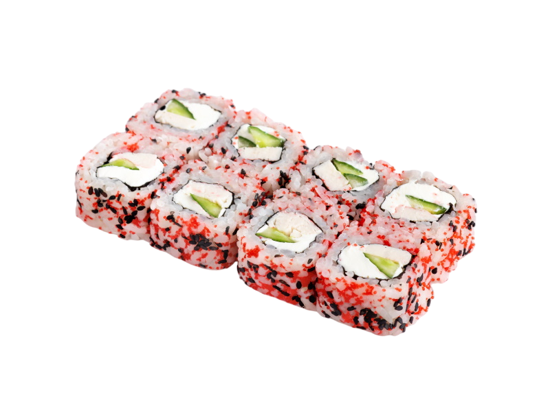 мясо краба (имитация), сыр, огурец, японский омлет, икра масаго, соус кабаяки, кунжут, рис, нори