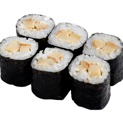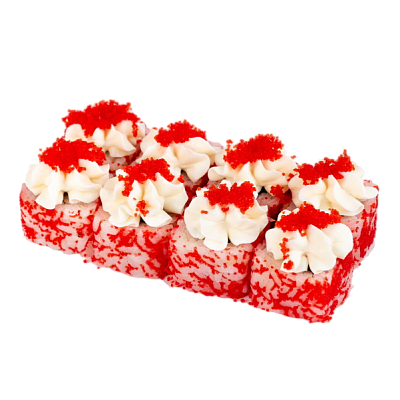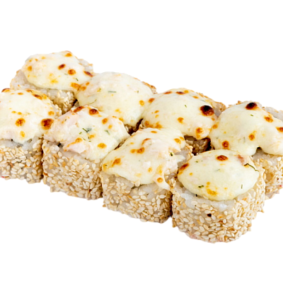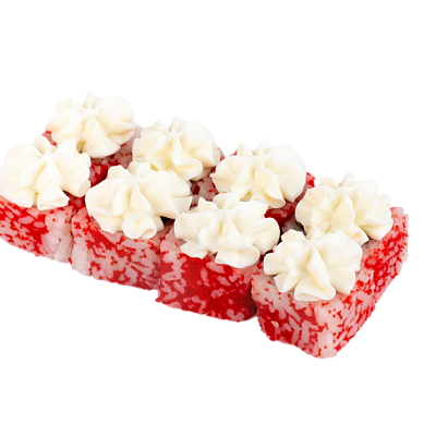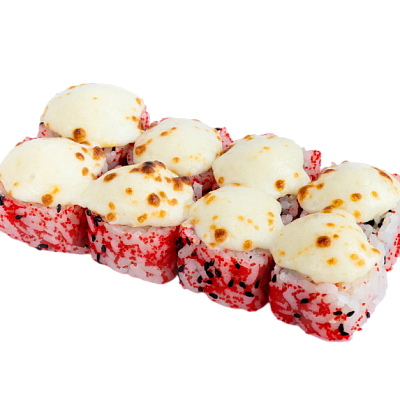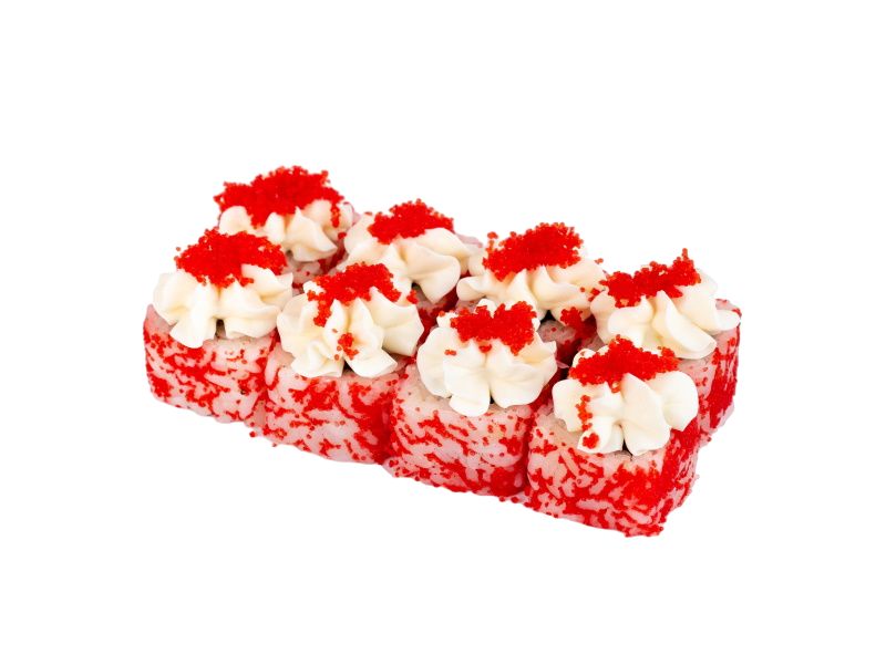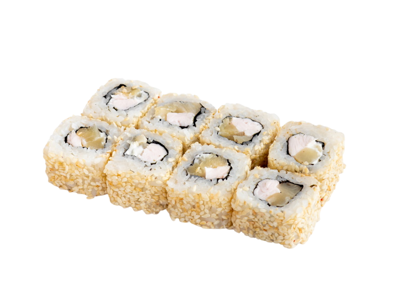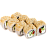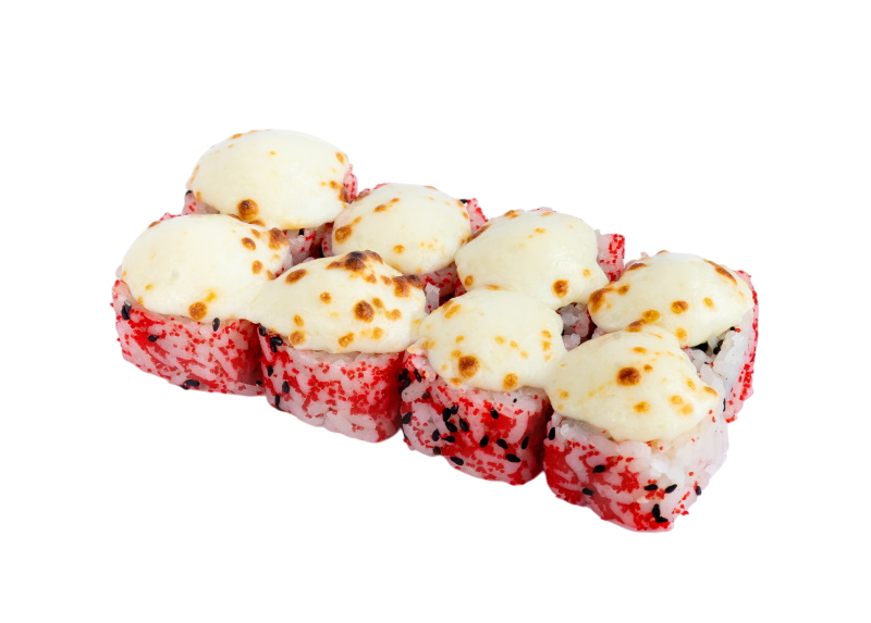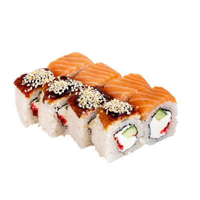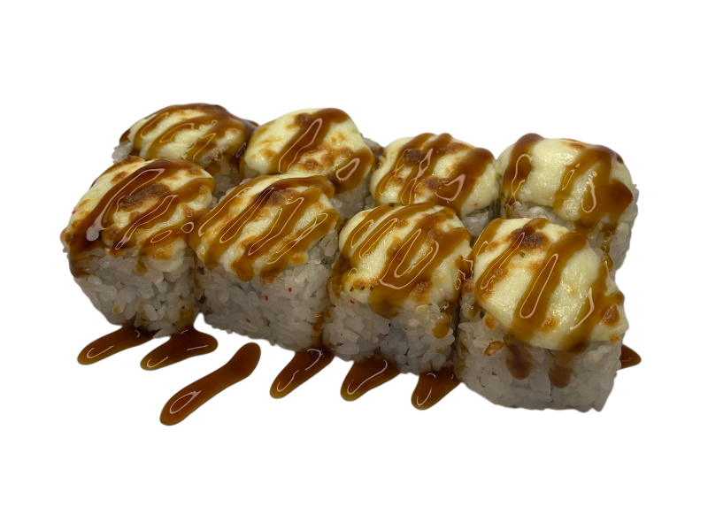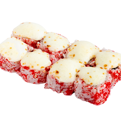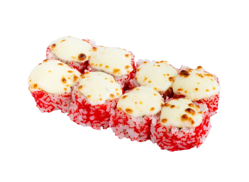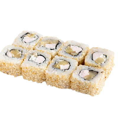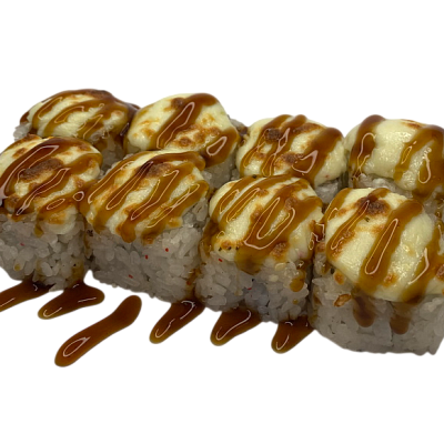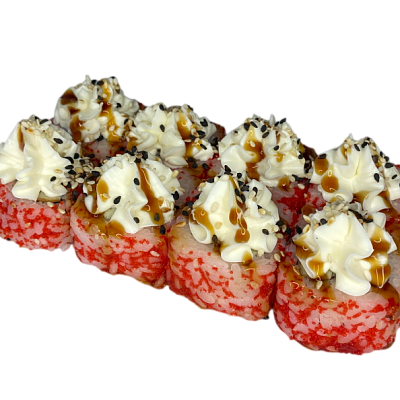 мясо краба (имитация), сыр, огурец, японский омлет, икра масаго, соус кабаяки, кунжут, рис, нори