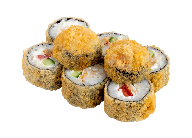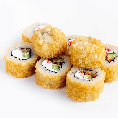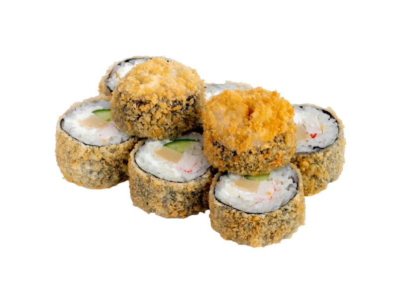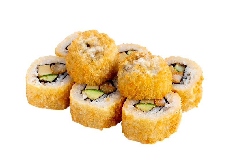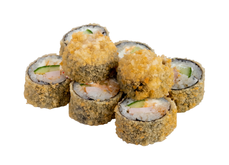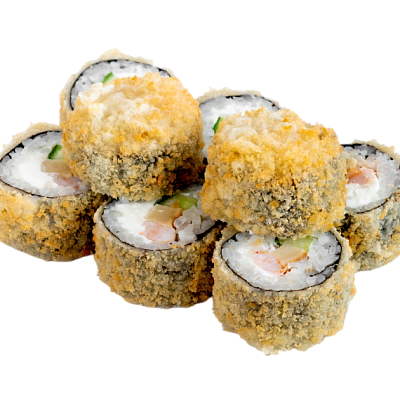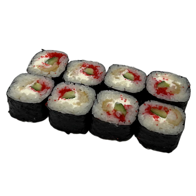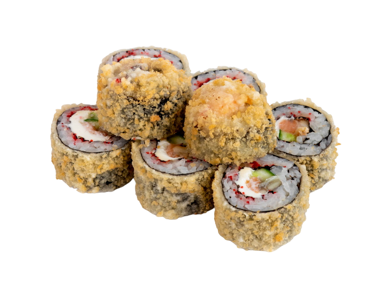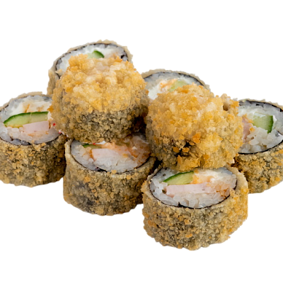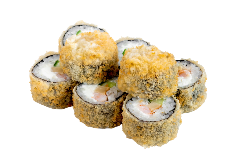 креветка жареная в сухарях, сыр, огурец, икра масаго, рис, нори