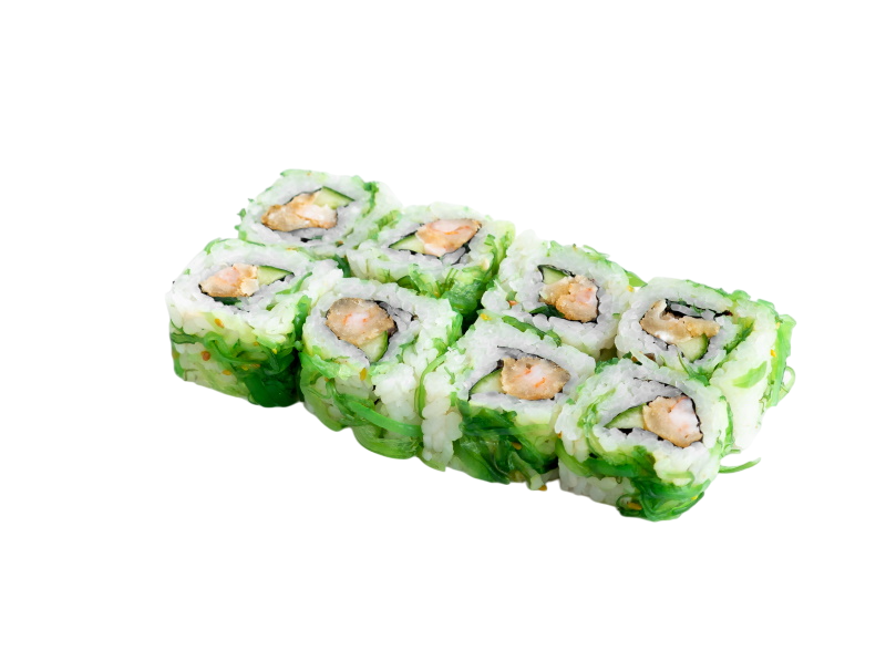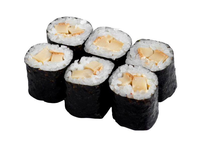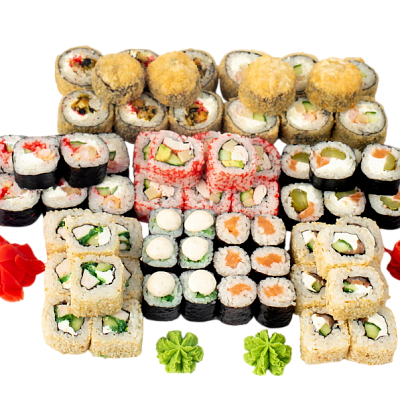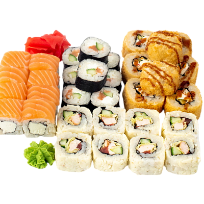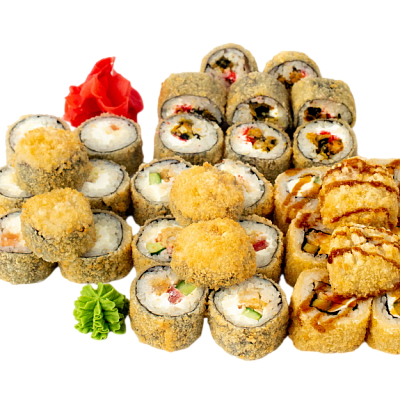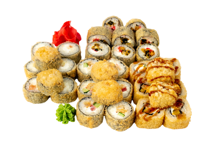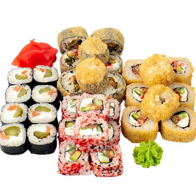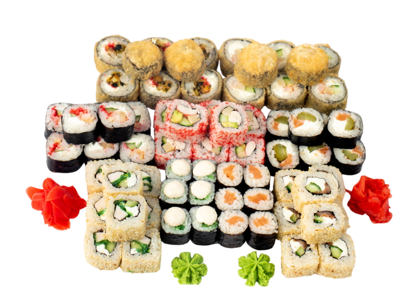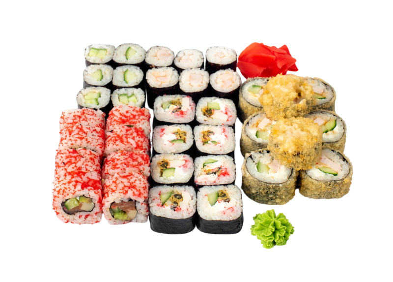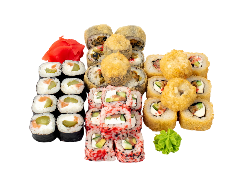 Чука маки, Сяке маки, Бусидо, Филадельфия в кунжуте, Тейшоку, Эби темпура, Калифорния с крабом, Нишики, Мидии темпура, имбирь, васаби, соевый соус