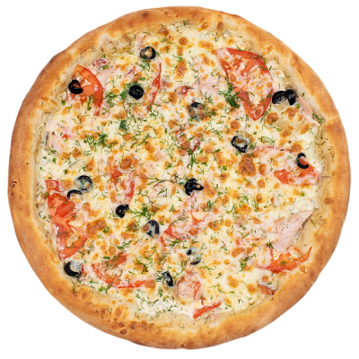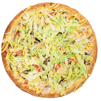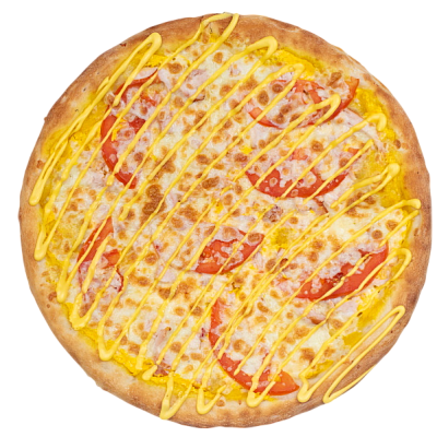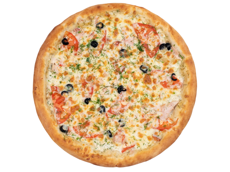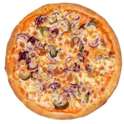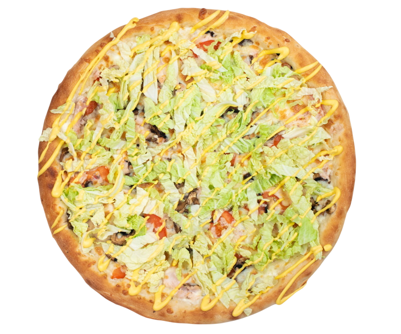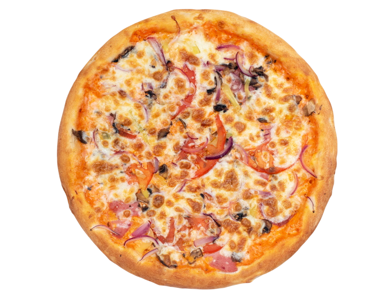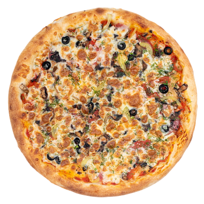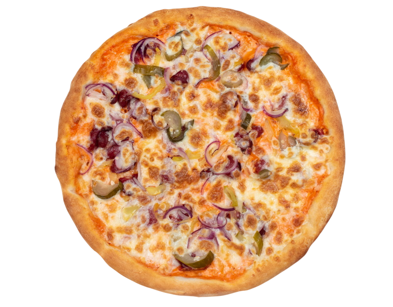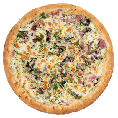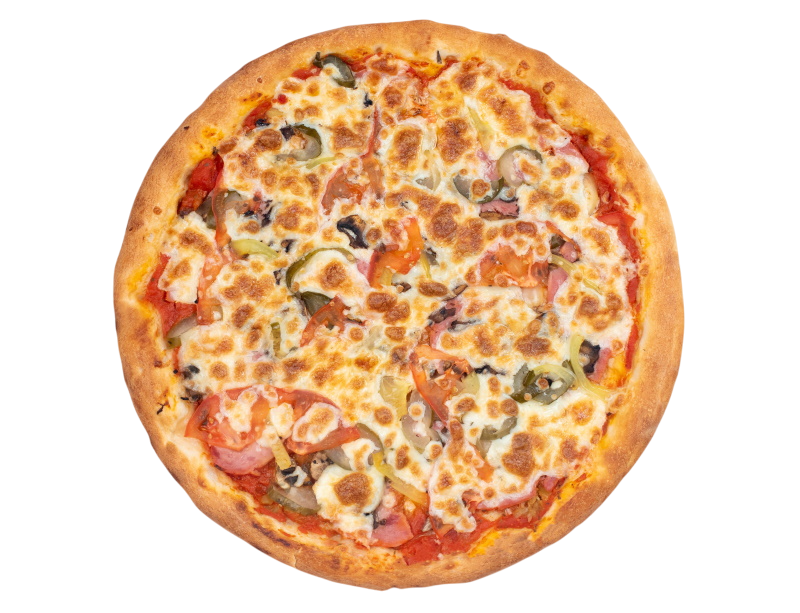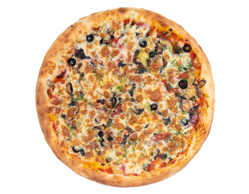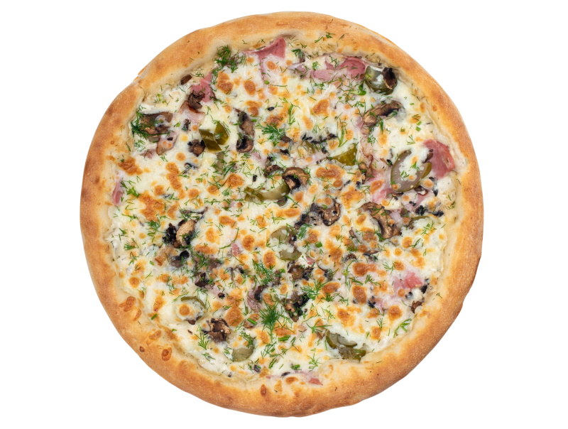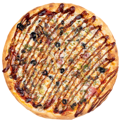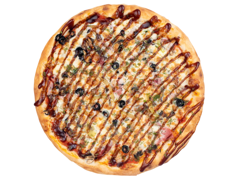 ветчина, салями, шампиньоны, маслины, болгарский перец, моцарелла, зелень, бекон, оригинальный томатный соус, соус барбекю