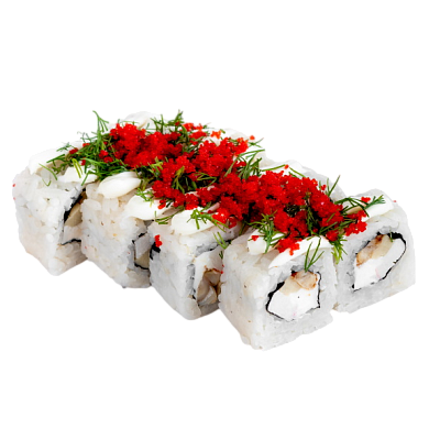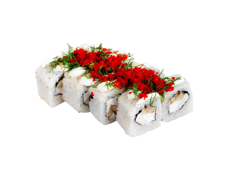 угорь, мясо краба (имитация), сыр, омлет, майонез, икра масаго, зелень, рис, нори