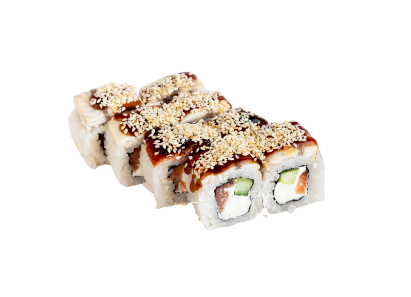 угорь, сёмга, сыр, огурец, кунжут, соус кабаяки, нори, рис