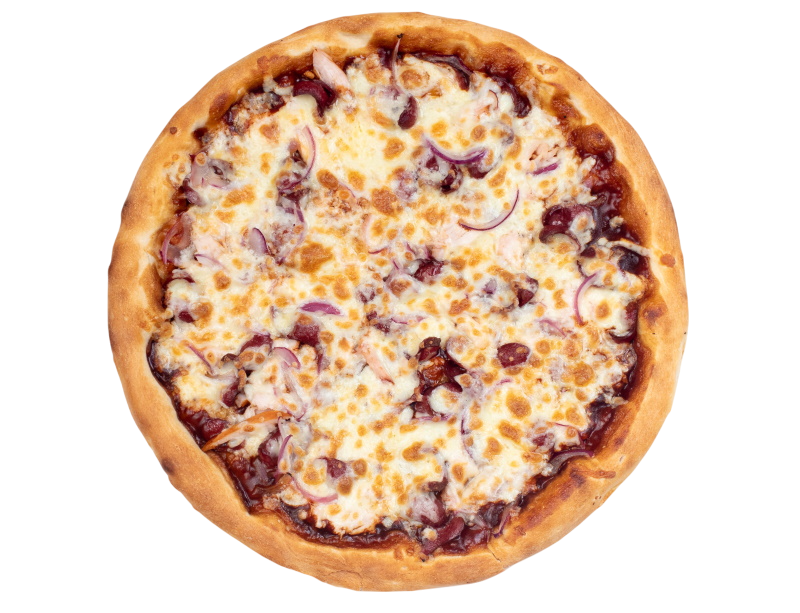 охотничьи колбаски, филе куриное, красный лук, моцарелла, соус барбекю