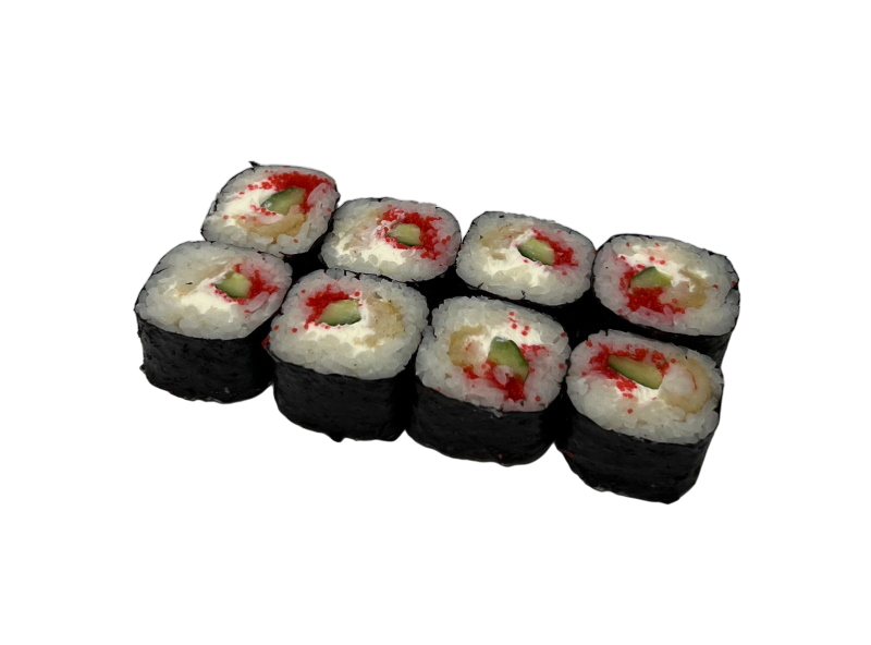 креветка, огурец, икра масаго, майонез, два вида сыра, кунжут, рис, нори