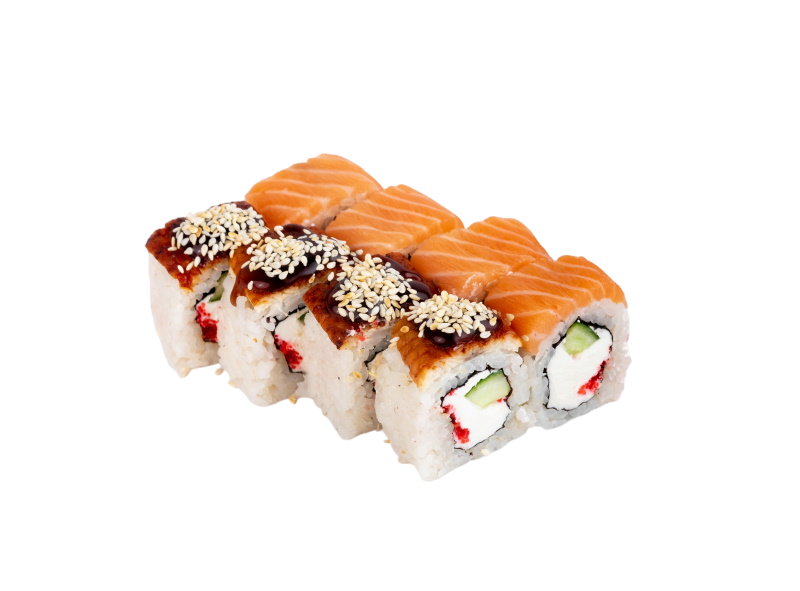 угорь, сёмга, сыр, огурец, икра масаго, соус кабаяки, рис, нори