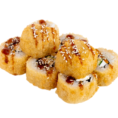 сёмга в кляре, сыр, огурец, соус кабаяки, кунжут, рис, нори