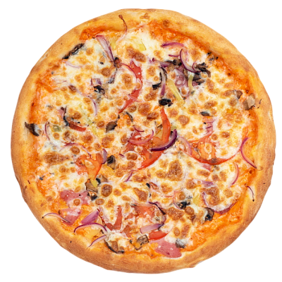 ветчина, салями, лук красный, шампиньоны, болгарский перец, помидоры, моцарелла, соус коктейль