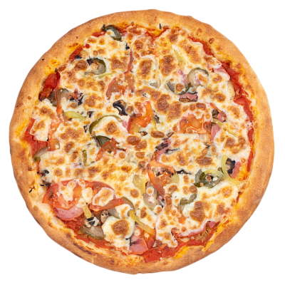 ветчина, салями, шампиньоны, помидоры, болгарский перец, маслины, моцарелла, зелень, оригинальный томатный соус